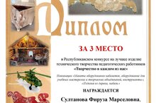 Ежегодно Республиканский центр внешкольной работы проводит республиканский конкурс на лучшие технические творческие разработки "Творчество в каждом из нас" среди педагогов дополнительного образования с целью обмена опытом, развития их творческой активности, освещения и оценки их инновационной, научно-технической деятельности. Здесь представляются наглядные материалы, макеты, движущиеся модели, технические устройства, тренажеры, делающие учебный процесс интересным и удобным для освоения. В этом году педагог Центра детского творчества Султанова Фируза Марселовна заняла почетное III место с устройством – мультстанок, позволяющим выполнять творческие проекты на занятиях дополнительного образования. Поздравляем!