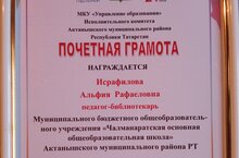 Педагог-библиотекарь МБОУ “Чалманаратская ООШ” Альфия Рафаиловна Исрафилова награждена Почётной грамотой МКУ "Управление образования" Исполнительного комитета Актанышского муниципального района РТ за многолетний добросовестный труд, высокий профессионализм и достигнутые успехи в обучении и воспитании подрастающего поколения. Поздравляем! Желаем дальнейших успехов.