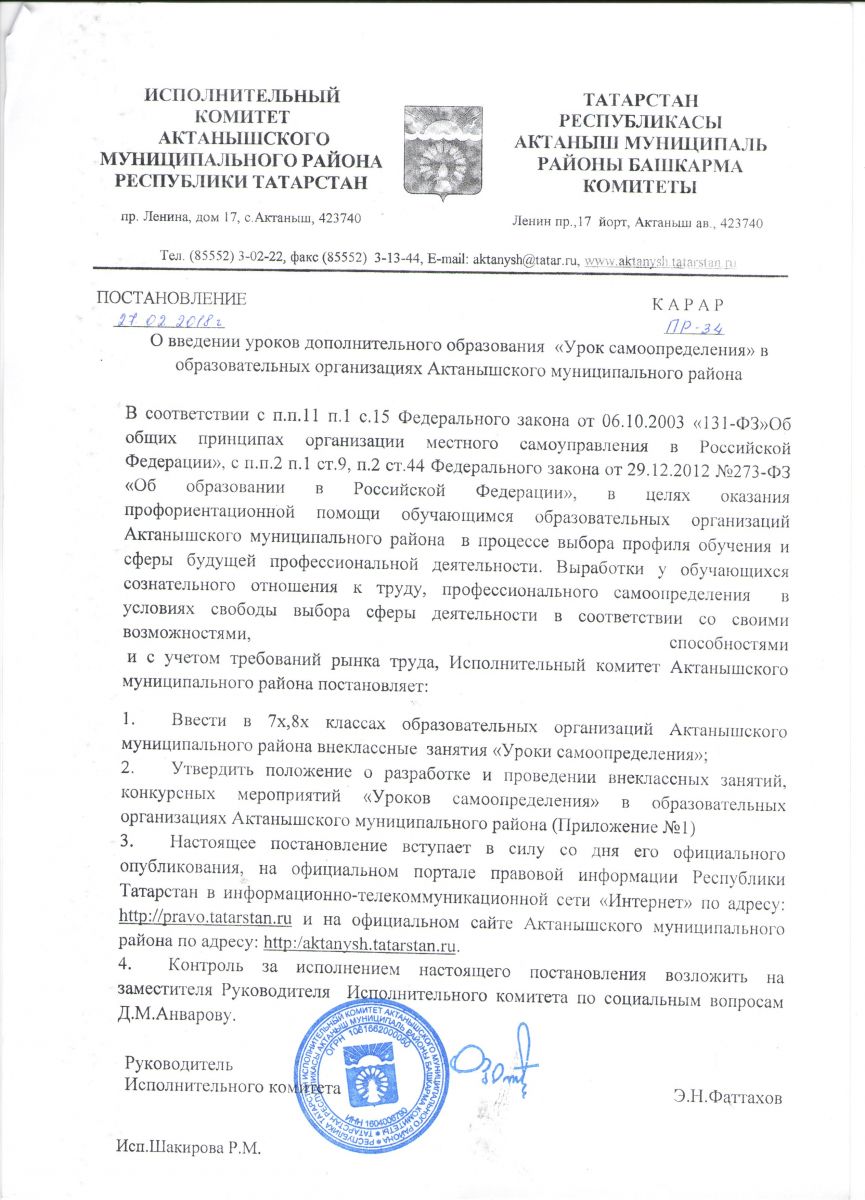 О введении уроков дополнительного образования "Урок самоопределения" в ОО Актанышского МР