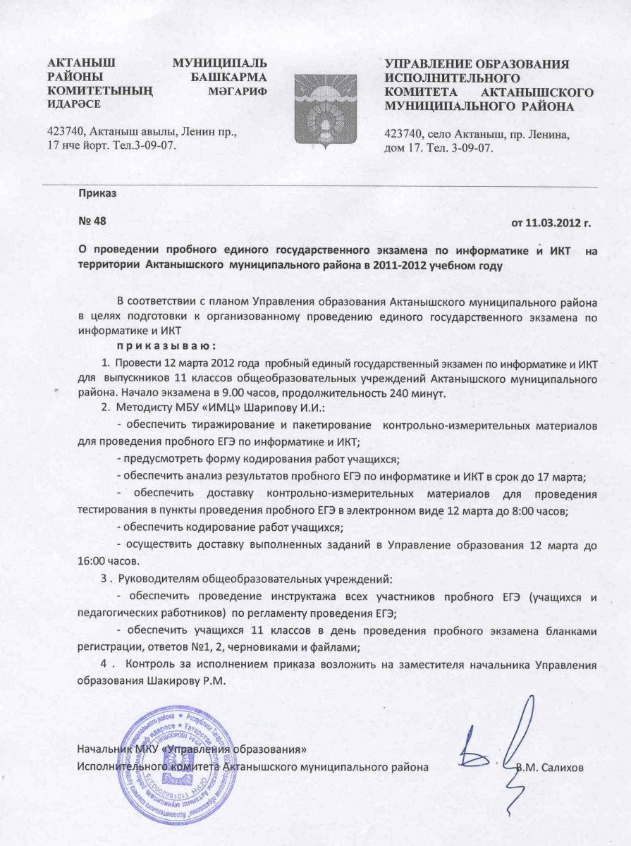 Приказ №48 (О проведении пробного ЕГЭ по информатике и ИКТ)