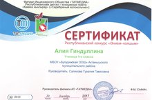 Мәктәбебезнең 1 нче класс укучысы Гиндуллина Алия "Көмеш кыңгырау" газетасы тарафыннан оештырылган "Әнием-кояшым" Республикакүләм иҗат бәйгесенә катнашып шаһәдәтнамәгә ия булды. Укытучысы Салихова Гүзәлия Гавис кызы. Котлыйбыз! Уңышлар телибез!