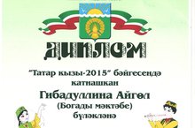 7 нче апрель көнне Актаныш мәдәният йортында "Татар кызы" бәйгесенең финал өлеше үткәрелде. Бу бәйгедә безнең мәктәптән 8 нче класс укучысы Гибадуллина Айгөл катнашты. Диплом һәм кыйммәтле бүләккә ия булды. Айгөлне котлыйбыз һәм алда уңышлар телибез.