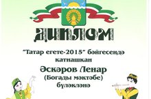 7 нче апрель көнне район мәдәният йортында "Татар егете" бәйгесенең финал өлеше үткәрелде. Бу бәйгедә безнең мәктәптән 6 нчы класс укучысы Аскаров Ленар катнашты. Ул Диплом һәм кыйммәтле бүләк белән бүләкләнде. Ленарны чын күңелдән котлыйбыз!