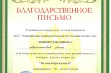 12 февраля состоялся муниципальный этап республиканского конкурса детского творчество “Во имя мира на земле”, посвященный 70- летию Победы. В конкурсе приняли участие учащиеся нашей школы Арсланова Энже- ученица 2 класса (руководитель- Салихова Г.Г.), Мирзагалиева Алия- ученица 3 класса (руководитель- Фаттахова Л.Д.), Ахмадуллин Рафаэль- ученик 4 класса (руководитель- Нуриева Г.Р.), Гибадуллина Айгуль и Мирзаханова Илина- ученицы 8 класса (руководитель- Зямилова Р.Г.). Все ученики награждены Благодарственными письмами МБУ “Актанышская межпоселенческая центральная библиотека”.