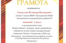 Ученик 7 класса Гиндуллин Исламнур занял I место в муниципальном этапе Всероссийского конкурса среди юнармейских отрядов на лучшее знание государственной символики России и Татарстана в 2020 году. Номинация: исследовательские работы по теме «Государственная символика Республики Татарстан». Руководитель: Зямилова Розалия Гарифяновна. Поздравляем!