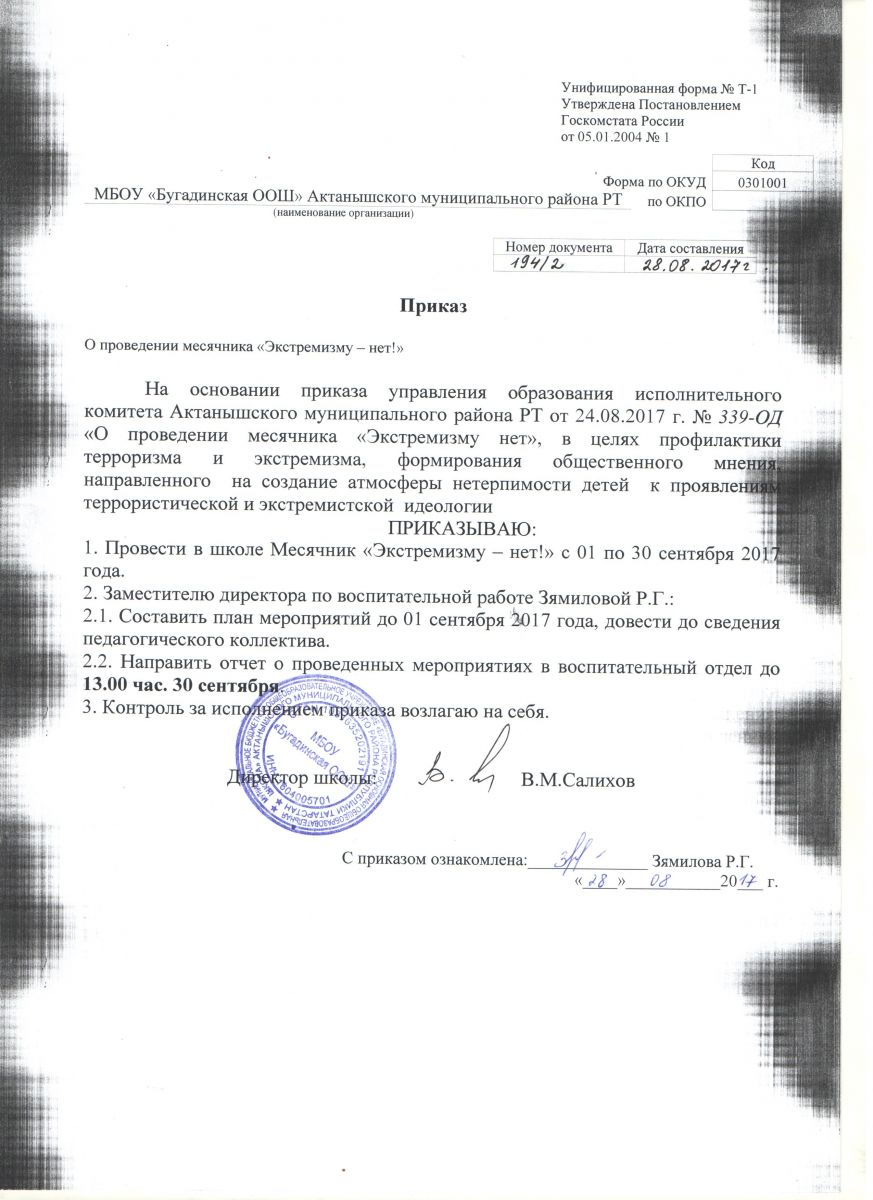 Приказ о проведении месячника Экстремизму нет 2017 год