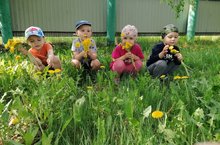 Дети наблюдали за красивыми жёлтыми одуванчиками. Определили где корень, стебель, лист, цветок, сравнили их с другими растениями.