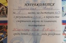 Ученик 4а класса Галимянов Амир занял I место на дистации 100 м в первенстве спортивной школы по плаванию, посвященного Женскому Дню 8 марта среди детей 2010-2011 года рождения. Молодец! Так держать!