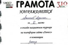4 а сыйныф укучысы Әхмәтов Азамат "Личесс" сайты платформасында онлайн шахмат турнирында рапид номинациясендә II урынны алды һәм грамота белән бүләкләнде. Афәрин! Котлыйбыз!