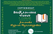 Библиотекарь школы Хисамова Нурсия Муллануровна приняла участие в онлайн-конференции "ВнеКлассные чтения" и награждена сертификатом главного редактора электронного журнала "Чтение детям". Желаем дальнейших успехов!