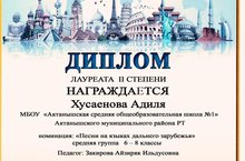 Ученица школы Хусаенова Адиля награждена дипломом лауреата II степени Республиканского фестиваля-конкурса вокалистов -исполнителей на иностранном языке "Talents" в номинации "Песня на языках дальнего зарубежья" средняя группа 6-8 классы. Педагог Закирова Айзиряк Ильдусовна. Молодцы! Поздравляем!