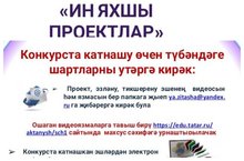 Укучылар игътибарына! Мәктәптә "Иң яхшы проектлар" конкурсы игълан ителә. Конкурста катнашу өчен түбәндәге шартларны үтәргә кирәк: Проект, эзләнү, тикшеренү эшенең видеосын һәм язмасын бер папкага җыеп ya.zitasha@yandex.ru почтасына җибәрергә кирәк була. Ошаган видеоязмаларга тавыш бирү https://edu.tatar.ru/aktanysh/sch1 сайтында махсус сәхифәгә урнаштырылачак. Конкурста катнашкан эшләрдән электрон һәм басма жыентык чыгарылачак. Иң күп тавыш жыйган эшләр "җиңүче" дип билгеләнәчәк һәм I, II, III дәрәҗә дипломнар белән бүләкләнәчәк.