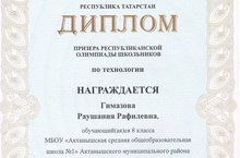 Поздравляем ученицу 8а класса Гимазову Раушанию, призера Республиканского этапа Всероссийской олимпиады школьников по технологии. Молодец! Так держать!
