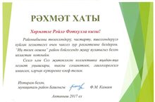 Районыбызны төзекләндерү, читарту, яшелләндерү буенча үткәрелгән "Иң төзек оешма" бәйгесендә җиңү яулаганы өчен мәктәбебез коллективына муниципаль район башлыгы Фаил Мисбахович Камаевның рәхмәт хаты һәм кыйммәтле бүләк тапшырылды. Афәрин! Киләчәктә дә зур җиңүләр теләп калабыз!
