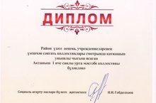Үзэшчән сәнгать смотрында 06.05.2017 Район үзәге оешма, учреждениеләренең үзешчән сәнгать коллективлары смотрында катнашып, мәктәбебез коллективы уңышлы чыгыш ясаганы өчен диплом белән бүләкләнде. Котлыйбыз! Киләчәктә дә уңышлар телибез!