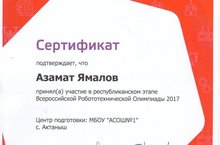 Команда учащихся школы в составе Фахразиева Раяза, Ибрагимова Амира, Миннимухаметова Гумара, Ахметова Иркена, Хабибуллина Юсупа, Насырова Гаделя, Салимова Марата успешно выступила в Республиканском этапе Всероссийской Робототехнической Олимпиаде 2017 и ребята награждены сертификатами. Руководителю команды - Ямалову Филарису Фанисовичу вручено блогадарственное письмо. Молодцы! Поздравляем!