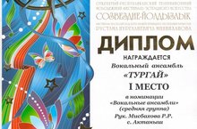 Вокальный ансамбль нашей школы "Тургай" (средняя группа) занял I место в номинации "Вокальные ансамбли". Руководитель - Мисбахова Райля Рафаковна. Они отправятся в город Казань на Суперфестиваль конкурса.