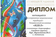 Дипломом "За сохранение национальных традиций" награжден танцевальный коллектив школы "Идель" в номинации "Хореография" (средняя группа) конкурса "Созвездие-Йолдызлык". Руководитель - Нугаманов Ю.В. Молодцы! Желаем дальнейших успехов!