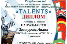 Республиканский фестиваль-конкурс вокалистов-исполнителей на иностранном языке "TALENTS" проводится ежегодно. В этом году мероприятие состоялось 26 марта в центре детского и молодежного творчества города Набережные Челны. В конкурсе приняли участие школьники из Альметьевска, Заинска, Мамадыша, Бавлов, Кукморы, Нурлата, Балтаси, Агрыза, Бугульмы.
