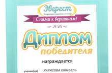 Учащиеся 3а класса Харисова Сюмбель, Гилаев Айнур, Амирханова Камиля, Ахметханова Гузель, Хусаенова Аделина, Басырова Резеда, Шарафутдинова Лилия, Гаянова Ленара, Насырова Сюмбель приняли участие в Международной предметной олимпиаде для школьников "Эверест" по предметам математика, русский язык, окружающий мир. Руководитель - Даутова Алсу Камиловна. Ребята награждены дипломами и сертификатами. Молодцы!