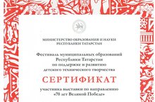 В городе Казани прошел Фестиваль муниципальных образований Республики Татарстан по поддержке и развитию детского технического творчества. На фестивале были представлены работы учащихся нашей школы. По итогам мероприятия Равиль Шаехов награжден сертификатом по направлению "Изобретательство", Ильназ Гайнуллин - по направлению "70 лет Великой Победе", Нурсолтан Харисов - по направлению "Деревообработка, швейные изделия". Руководитель учащихся - учитель технологии Мухамадиев Дильшат Сагитович. Поздравляем!
