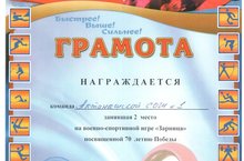 На базе ГБОУ "Актанышская Кадетская школа-интернат имени Героя Советского Союза Хасана Заманова" прошел районный этап военно-спортиной игры "Зарница", посвященный 70-летию Победы в Великой Отечественной войне. Команда учащихся нашей школы (руководитель - учитель ОБЖ Хазиев Р.Ф.) заняла почетное II место. Команда награждена грамотой. Молодцы, ребята! Так держать!