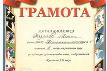 20 февраля прошел районный тур республиканской олимпиады юных изобретателей "Кулибины XXI века". Ученик 5А класса Фазлиев Рамис (руководитель - Фазлиев Алмаз Гафиятович) занял I место, учащийся 9А класса Гайсин Айнур (руководитель - Мухамадиев Дильшат Сагитович) на II месте, Муллагалиев Айназ и Галимянов Айдар награждены сертификатами участников. Рамис будет защищать честь района на республиканском туре конкурса. Молодцы, ребята! Желаем дальнейших успехов!