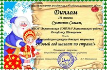 Ученик 4Б класса Султанов Самат (классный руководитель - Камалова Нурсия Закариовна) принял участие во Всероссийском детском творческом конкурсе "Новый год шагает по стране" и стал обладателем диплома III степени. Поздравляем!