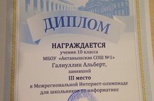 Ученик 10 класса Галиуллин Альберт (учитель - Галиева Рузиля Ферролевна) принял участие в Межрегиональной Интернет-олимпиаде для школьников по информатике и занял III место. Поздравляем!