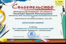 Библиотекарь школы Хисамова Нурсия Муллануровна опубликовала свой авторский материал "Китап - белем чишмәсе" на странице интернет-проекта "Копилка уроков - сайт для учителей". Ей присвоен сертификат.