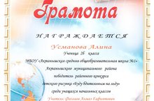 Поздравляем ученицу 2Б класса Усманову Алину (руководитель - Фазлиев Алмаз Гафиятович), победителя районного конкурса детского рисунка "Буду бдительным на льду". Желаем дальнейших успехов!