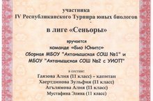 Сборная команда нашей школы и школы №2 "Био Юнитс" в составе учащихся 11 классов Гаязовой Алии, Хаертдиновой Зульфии, Агълямовоой Алии, Мустафины Элины приняли участие в лиге "Сеньоры" IV Республиканского турнира юных биологов и были награждены сепртификатами участников. Их учителя Ханнанова Руфина Рифовна и Хусаенова Розалия Ринатовна награждены благодарственными письмами за подготовку команды. Молодцы! Поздравляем!