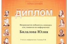 Поздравляем Билалову Юлию (учитель - Галиева Р.Ф.), награжденную дипломом от издательского дома "Первое сентября" за победу в конкурсе для учащихся по информатике. Молодец,Юлия!