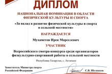 Учитель физической культуры Мухаметов Ирек Марселевич стал победителем Всероссийского смотра-конкурса на лучшую постановку физкультурно-спортивной работы среди предприятий, учреждений и организаций по итогам 2013 года и награждён дипломом Министерства спорта РФ в национальной номинации в области физической культуры и спорта "За вклад в развитие физической культуры и спорта в сельской местности". Спасибо за Ваш труд, Ирек Марселевич!