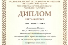 Ученица 10 класса Мустафина Элина (руководитель - Ханнанова Руфина Рифовна) награждена дипломом за содержательный научно-исследовательский проект на XX Поволжской научной экологической конференции школьников. Молодец, Элина! Так держать!