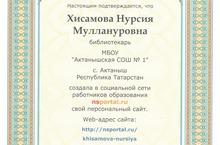 С интернет-сайтом нашего библиотекаря Хисамовой Нурсии Муллануровны вы можете ознакомиться по web-адресу http://nsportal.ru/khisamova-nursiya//