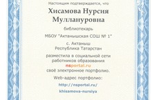 Библиотекарь школы Хисамова Нурсия Муллануровна разместила с социальной сети работников образования своё электронное портфолио. Web-адрес портфолио: http://nsportal.ru/khisamova-nursiya//