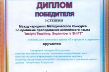 Учитель английского языка Закирова Айзиряк Ильдусовна награждена дипломом 3 степени Международного Методического Конкурса по проблеме преподавания английского языка "Insight Teaching. September". Дальнейших успехов вам!