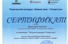 Ученица 3А класса Даутова Айзиля (руководитель - Ахунова Илиза Энгеловна) награждена сертификатом за участие в номинации "Рисунки природы Татарстана" творческого конкурса "Земля моя - Татарстан". Молодец, Айзиля!