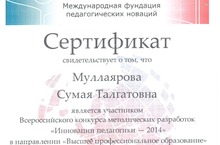 Учитель начальных классов Муллаярова Сумая Талгатовна награждена сертификатом участника Всероссийского конкурса методических разработок "Инновации педагогики - 2014" в направлении "Высшее профессиональное образование". Спасибо за ваш труд, Сумая Талгатовна!