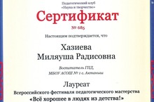 Воспитатель группы продленного дня Хазиева Миляуша Радисовна приняла участие в Всероссийском фестивале педагогического мастерства "Все хорошее в людях из детства" и стала обладательницей сертификата лауреата.
