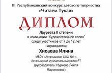 На III Республиканском конкурсе детского творчества "Читаем Тукая" в Мамадыше ученица 4Б класса Хисаева Илина стала Лауреатом 2 степени в номинации "Художественное слово". Руководитель Нуриева Лейла Марсельовна. Поздравляем!