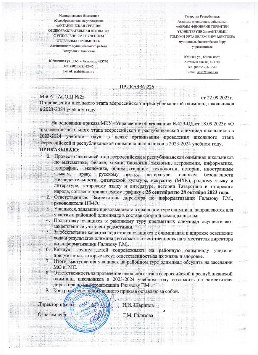 Муниципальное бюджетное общеобразовательное учреждение «Актанышская средняя общеобразовательная школа №2 с углубленным изучением отдельных предметов» Актанышского муниципального района Республики Татарстан / Татарстан Республикасы Актаныш муниципаль районы «Аерым фәннәрне тирәнтен үзләштерүле Актаныш икенче урта гомуми белем бирү мәктәбе» муниципаль бюджет гомуми белем бирү учреждениесе