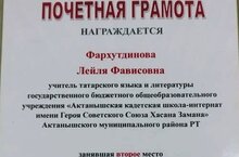 Поздравляем учителя татарского языка и татарской литературы Фархутдинову Лейлю Фависовну, занявшую ВТОРОЕ место на муниципальном этапе Всероссийского конкурса "Лучший учитель татарского языка и татарской литературы".