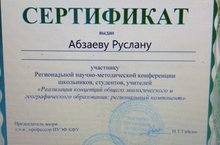 Ученик 7 класса Абзаев Руслан принял участие в региональной научно-методической конференции школьников, студентов, учителей "Реализация концепций общего экологического и географического образования: региональный компонент".