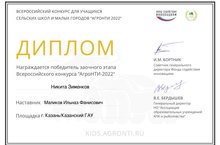Ученик 7 класса нашей школы Зименков Никита(руководитель Маликов И.Ф.) стал победителем заочного этапа Всероссийского конкурса "АгроНТИ-2022".