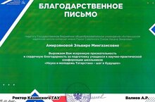 Учитель русского языка и литературы нашей школы Амирзянова Э.М. награждена Благодарственным письмом за подготовку учащихся к научно-практической конференции школьников "Наука и молодёжь Татарстана - шаг в будущее".