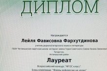 Учитель татарского языка и татарской литературы нашей школы Фархутдинова Л.Ф. стала лауреатом Всероссийского конкурса "ФГОС класс" блиц-олимпиады "Формы рефлексии на уроке" и награждена Дипломом. Поздравляем!