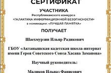 Ученик 7 класса нашей школы Шаехмурзин Ильяр(руководитель Маликов И.Ф.) принял участие в Республиканском конкурсе "Галактика информационной безопасности" в номинации "Лучшая памятка" и получил сертификат.