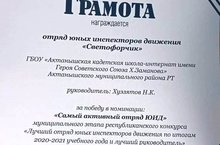 Отряд юных инспекторов движения "Светофорчик" ГБОУ "Актанышская КШИ" (руководитель Хуззятов Н.К.) награждён Грамотой за победу в номинации "Самый активный отряд ЮИД" муниципального этапа республиканского конкурса "Лучший отряд юных инспекторов движения по итогам 2020-2021 учебного года и лучший руководитель".